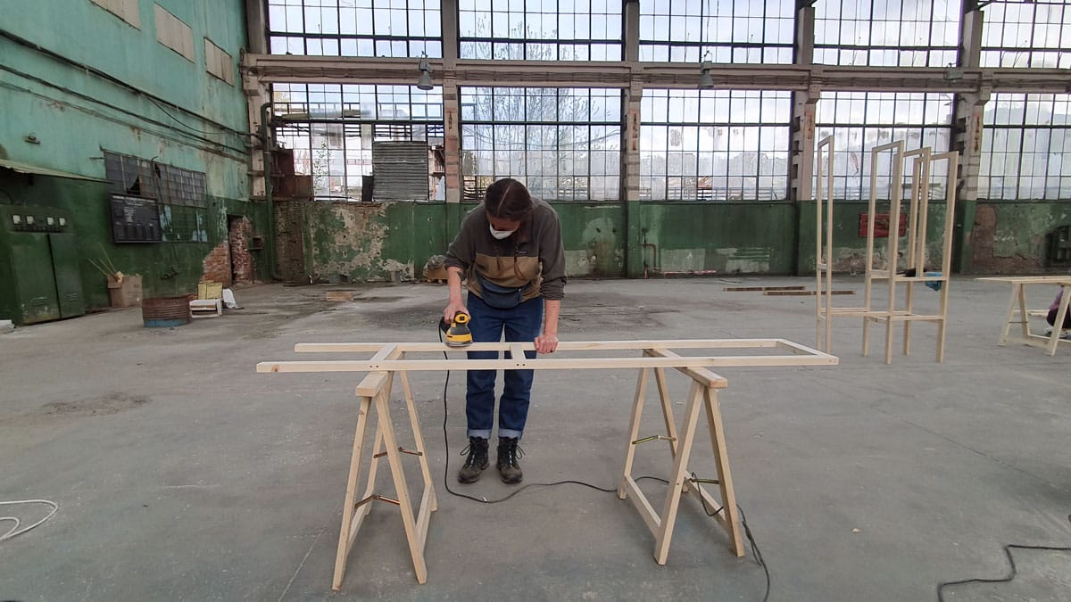 Am construit 15 astfel de scări pentru fiecare arc de cerc, unite cu câte 4 scânduri pentru a forma arcuri cu lungimi de aproximativ 8 metri. Întreg procesul de înșurubare a fost realizat cu mare atenție, iar gaurile au fost ulterior astupate cu cepuri din lemn de fag și șlefuite pentru un finisaj impecabil. Rezultatul final a constat în două semicercuri identice, dispuse în oglindă, care se întrepătrund pentru a crea structura impunătoare a standului expozițional.